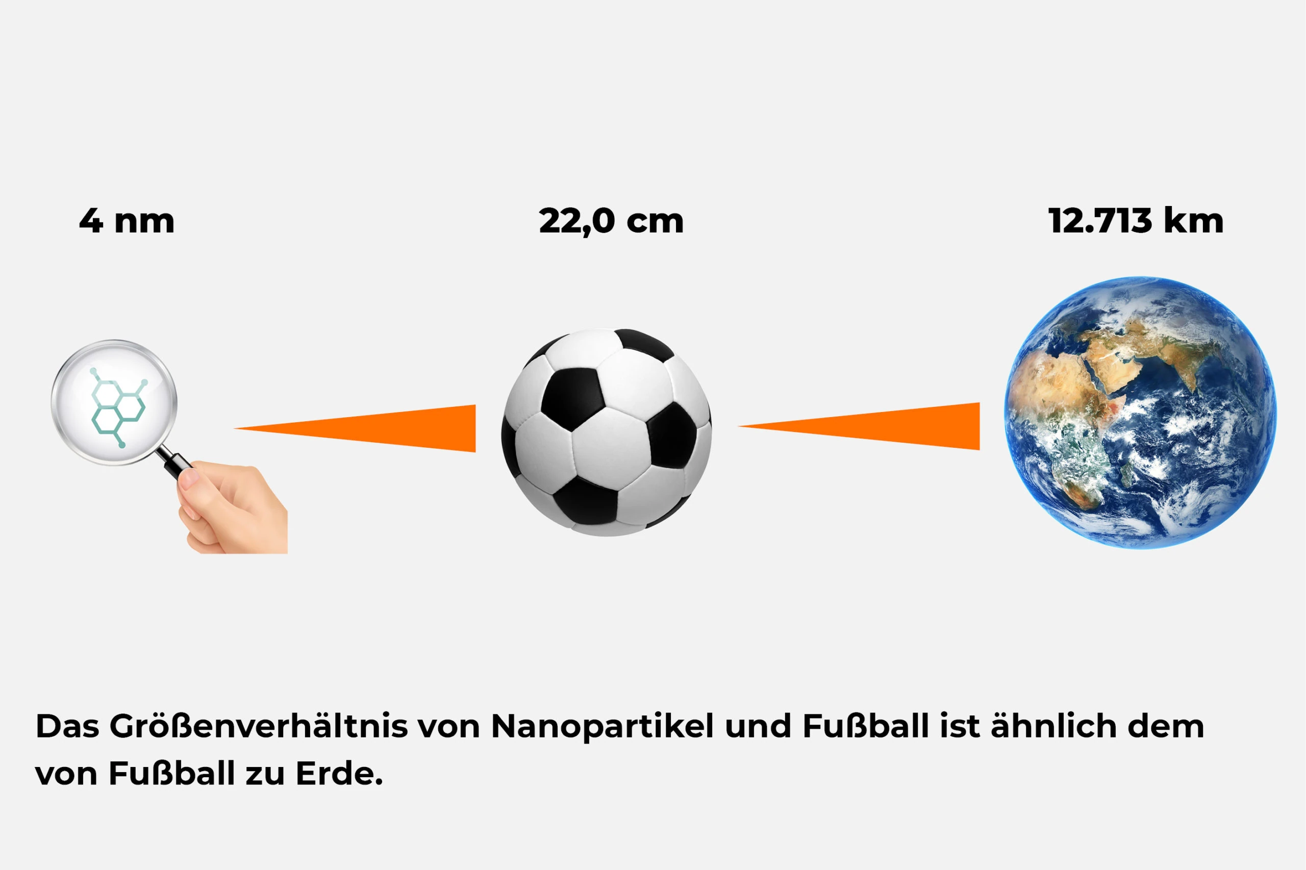 Die folgende Grafik veranschaulicht die Größenverhältnisse. Hier steht ein Feinstaubpartikel im Verhältnis zum Fußball so wie der Fußball zur Erde.